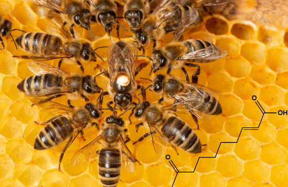Pozorujeme ich najmä u včelej kráľovnej, v ktorej sekréte sa nachádza až 14 zlúčenín. Z nich je významná napríklad kyselina trans-9-oxo-2-decénová (obr. 9), ktorá priťahuje trúdy a stimuluje ich k páreniu, a zároveň aktivuje robotnice k zberu nektáru, ku kŕmeniu a čisteniu kráľovnej. Zaujímavosťou je, že táto kyselina taktiež brzdí rozvoj vaječníkov u robotníc.