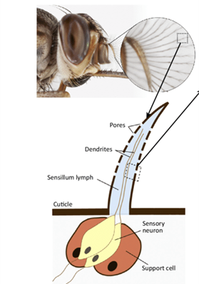 Čuchové orgány hmyzu sú sústredené na tykadlách, kde sa nachádzajú jemné čuchové brvy. Na týchto brvách sa nachádzajú póry a ich vnútro vypĺňa tekutina plná dendritov zmyslových buniek. Molekuly, prostredníctvom ktorých hmyz komunikuje, preniknú pórom na brve až na dendrit zmyslovej bunky. Vzniknutý akčný potenciál spôsobí bioelektrický vzruch a čuchový podnet sa šíri do nervového centra (obr. 1).