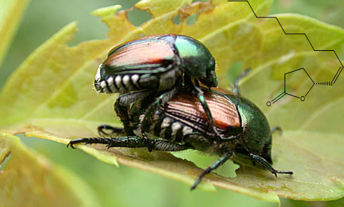 Príkladom sexuálneho feromónu je R-japonilure. Ide o feromón samíc chrústovca japonského (Popillia japonica) (obr. 4), invázneho škodcu, ktorý pochádza z Japonska a do Európy bol zavlečený.
