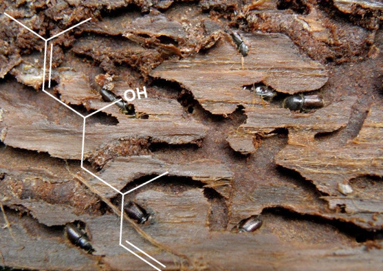 Obr. 6: Drevo napadnuté lykožrútom Ips typographus, ktorý na prilákanie ďalších jedincov použil svoj agregačný feromón – ipsdienol