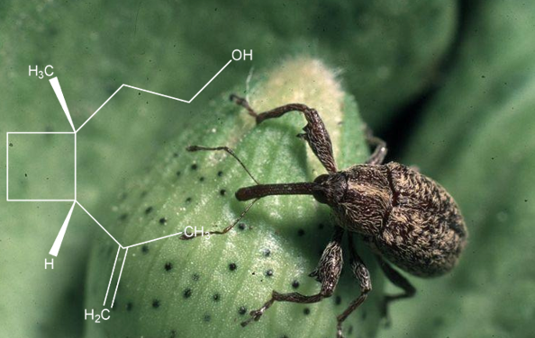 Obr. 5: Nosánik bavlníkový (Anthonomus grandis) a jeho agregačný feromón grandisol